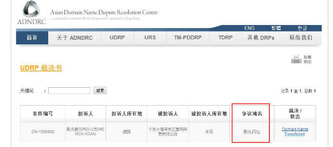 2014年,我国“.网址”域名经ICANN批准成为全球通用的顶级中文域名,是全球提供公开注册服务的新通用顶级域名之一。因其通用性强、品牌直观、易记易传播等属性成为中国域名市场的一匹黑马,成为全球注册量第一的中文新通用顶级域名。 但是由于企业对于中文域名的保护意识的不足和反应速度的不及时,导致像“人头马.网址”“强生美瞳.网址”“默克.网址”等众多国际知名企业网址域名被抢注,纷纷向亚洲域名争议解决中心(ADNDRC)投诉仲裁。